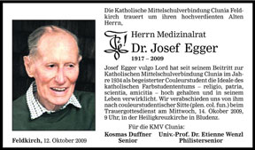 Wir trauern um unseren Bundesbruder MedizinalratDr. Josef Egger v/o Lord (1917-2009).Fiducit!